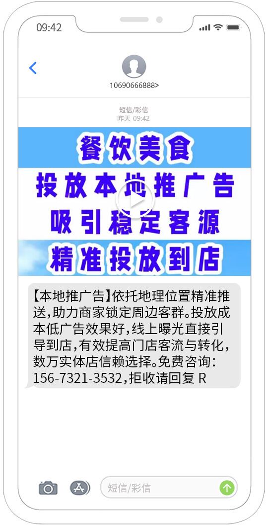 2、視頻短信三網覆蓋,5秒必達,手機適配度可達99.99%,2MB大小內容相當于30秒高清視頻,5張高清圖片或者幾十萬文字小說。信息保存于短信收件箱內,可隨時反復查看,增強營銷效果。
